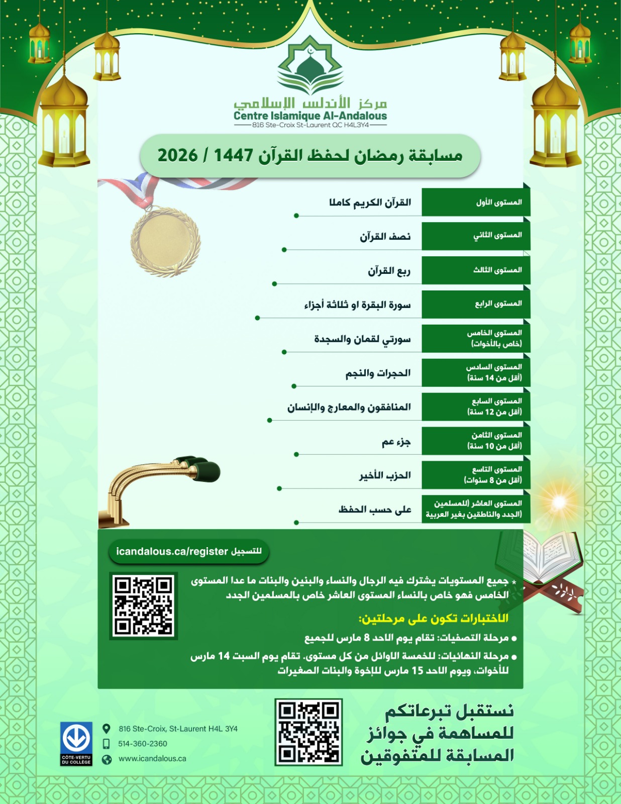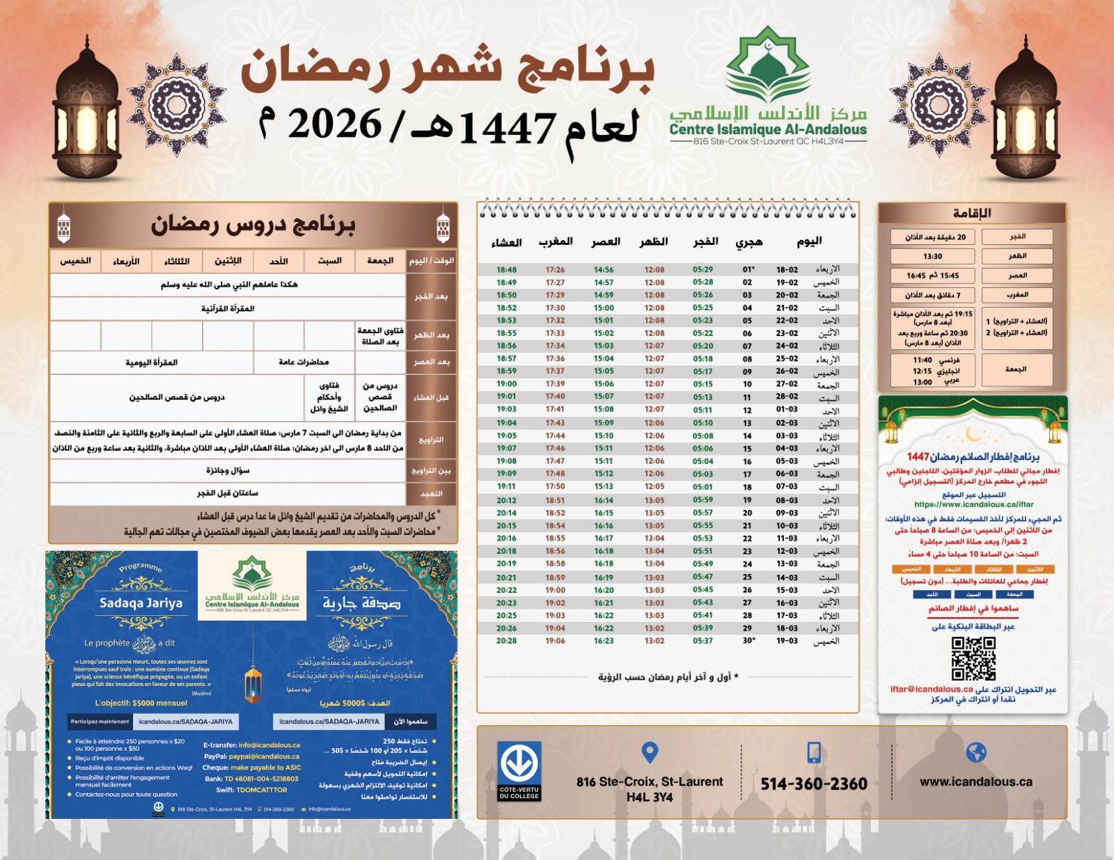 ✨ برنامج إفطار الصائم لرمضان 1445 يسعدنا أن نعلمكم بتفاصيل برنامج إفطار الصائم لرمضان 1445، والذي يهدف إلى تقديم الدعم لأفراد مجتمعنا خلال هذا الشهر المبارك. ⭐ توزيع قسيمات إفطار مجاني من الاثنين إلى الخميس في أحد المطاعم المشاركة: مخصصة للطلبة والزوار المؤقتين. 📝 يشترط التسجيل عبر الرابط: https://www.icandalous.ca/iftar ⭐