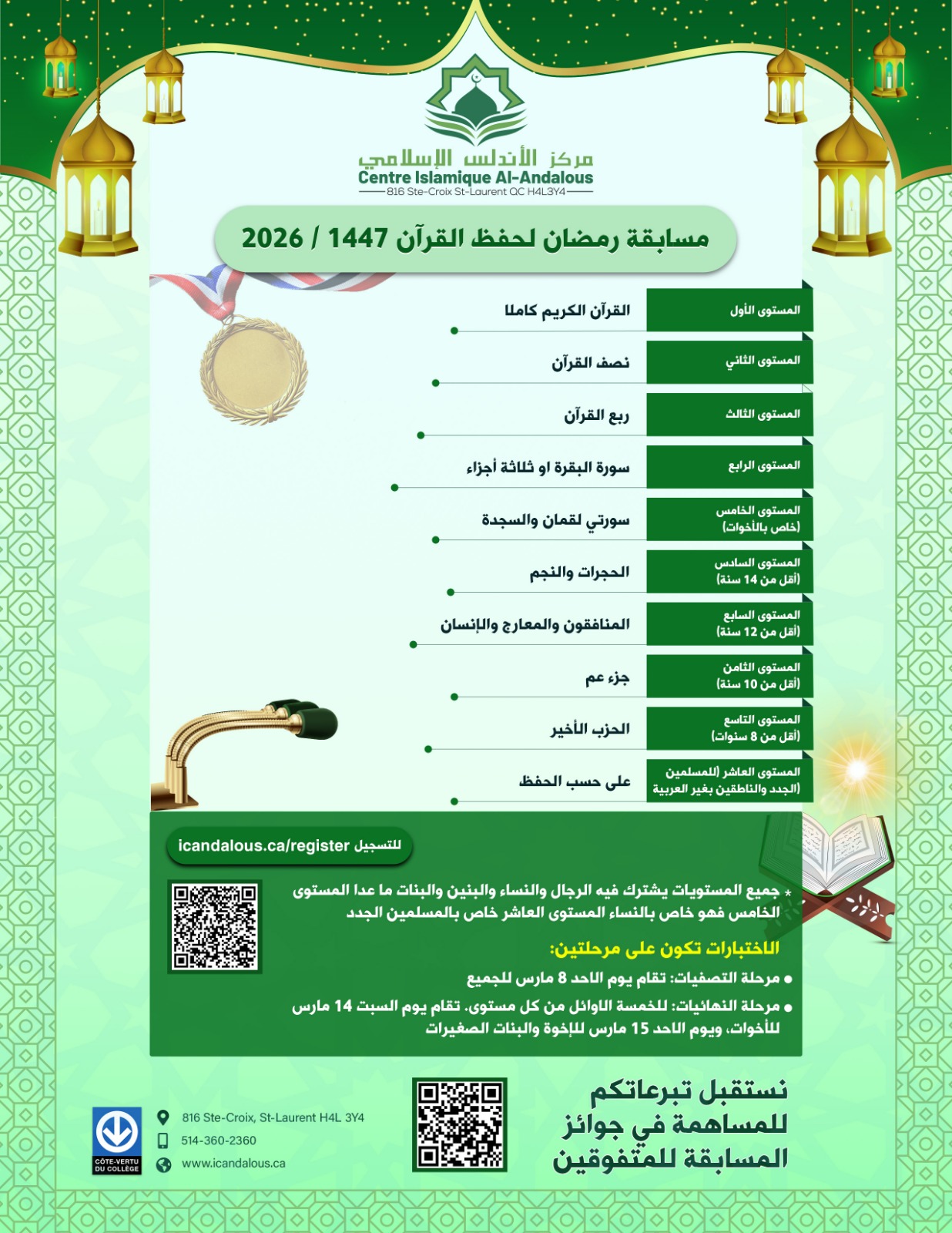 السلام عليكم و رحمة الله وبركاته 💫 يسر مركز الأندلس الإسلامي ابلاغكم أن الخميس 19 فيفري 2026 هو أول أيام شهر رمضان المبارك .💫 رمضان مبارك وتقبل الله منا و منكم صالح الأعمال Assalamou alaikoum warahmatoullah 💫 Le Centre Islamique Al-Andalous est heureux de vous annoncer que jeudi 19 fevrier