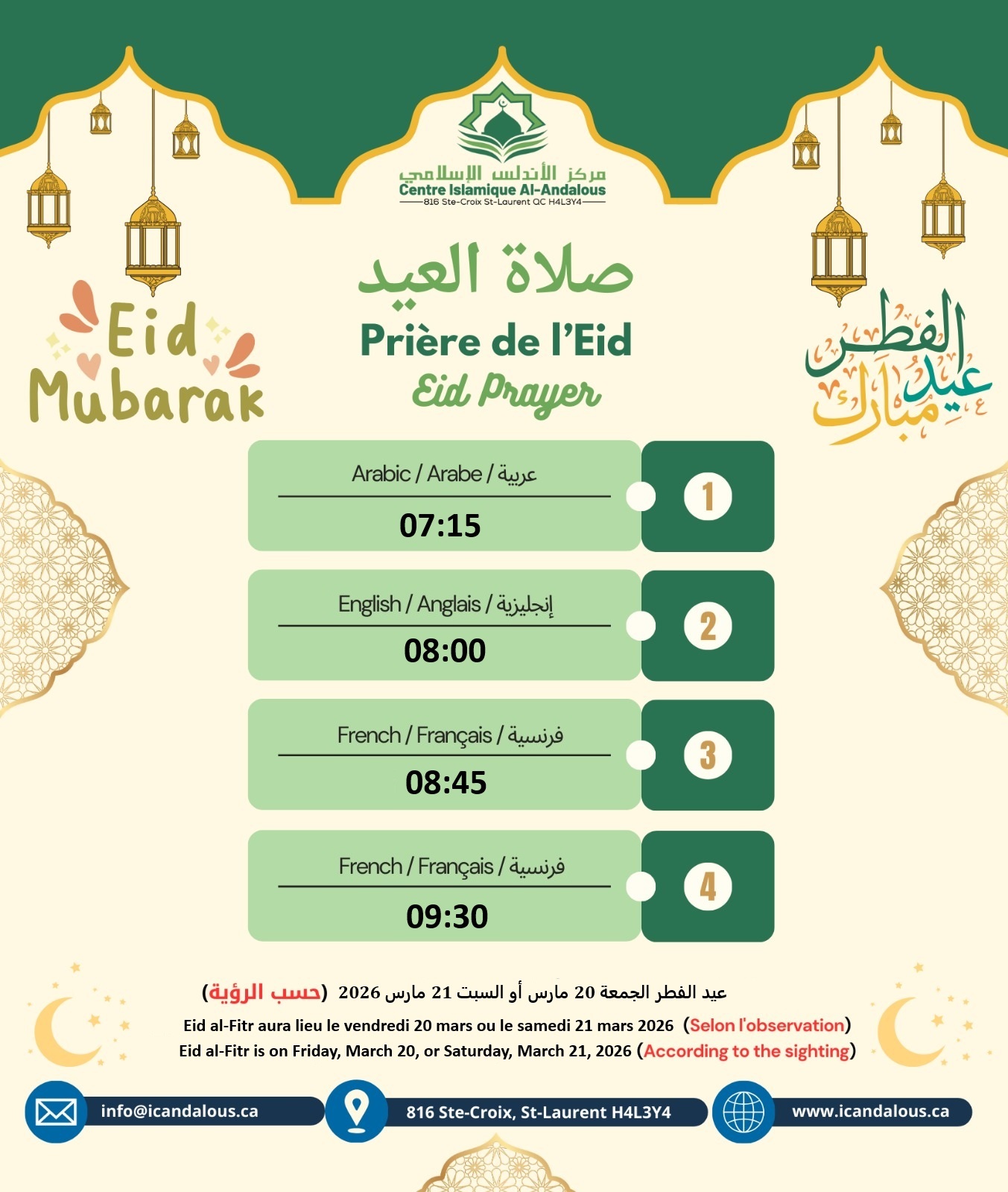 السلام عليكم ورحمة الله وبركاته من *مركز الأندلس الإسلامي* إلى جميع الإخوة والأخوات الكرام نزف لكم قدوم *عيد الفطر المبارك يوم الأحد 30 مارس 2025*. تقبل الله منا ومنكم الصيام والقيام والصدقات وصالح الاعمال نسأل الله تعالى أن نكون جميعاً قد كتبنا من الذين أعتقوا من النار وندعو لجميع إخواننا