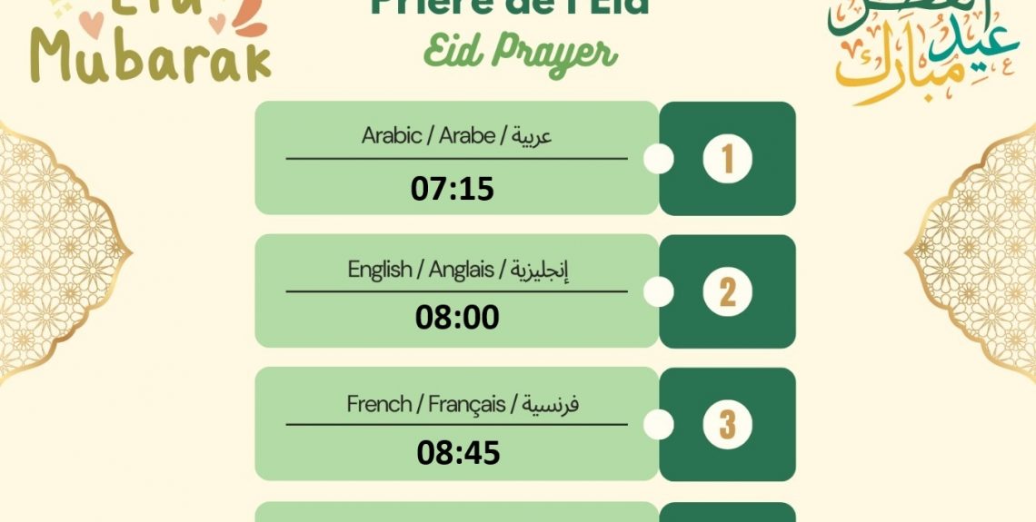 Nous vous annonçons avec joie l’arrivée de l’Aïd al-Fitr, qui aura lieu le dimanche 30 mars 2025.